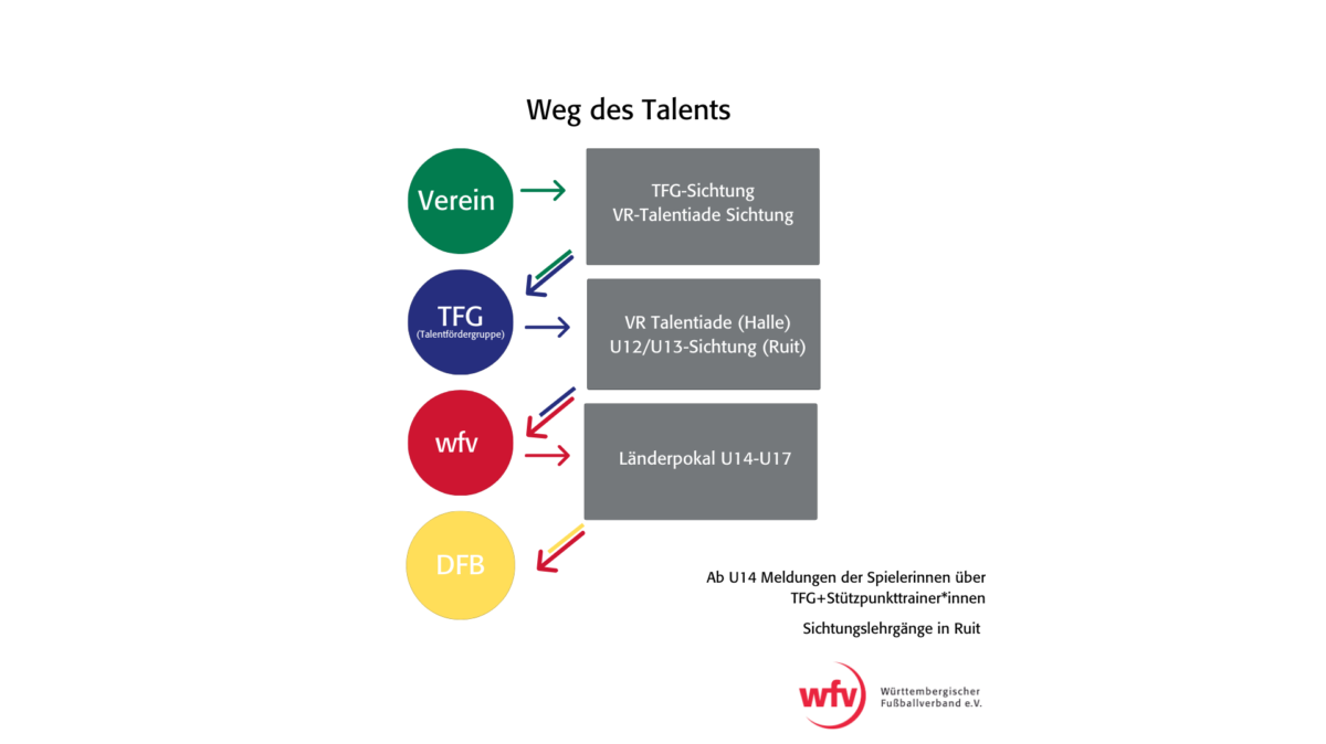 In den Landesauswahlmannschaften des wfv werden die besten Spielerinnen Württembergs in den Altersstufen U12 bis U19 gefördert. Einmal jährlich findet für die Jahrgänge U14, U16 und U19 der DFB-Länderpokal / Sichtungsturnier in Duisburg statt, bei denen sich die Spielerinnen dem DFB vorstellen.