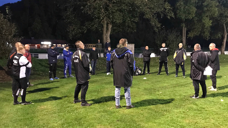 Im Bezirk Schwarzwald fand diese NEU in zwei Bereiche aufgeteilte Kurzschulung erstmals so statt. Hierbei mussten die angemeldeten Teilnehmer im Vorfeld des praktischen Teils, welcher am Dienstag, 12.10.2021 durchgeführt wurde, online Aufgaben (edubreak® ist die Video-Lernplattform für die Aus- und Weiterbildung mit dem methodischen Schwerpunkt Social Video Learning) erledigen beziehungsweise sich mit dem Thema auseinandersetzen. Dazu bekam jeder eine Einladung mit entsprechenden Zugangsinformationen zur Plattform. Als weitere Neuerung fand dann die Praxisschulung mit einer Demogruppe des FC Epfendorf, bestehend aus den B-/ und A-Junioren auf dem Sportgelände in Epfendorf statt. Dietmar Anders (Donaueschingen) und Christoph Schmidt (Reutlingen) vom WFV-Trainerlehrstab teilten sich dabei ihre Aufgaben des durchführenden und erklärenden auf. Somit konnten sich alle Teilnehmer voll auf die Demogruppe und den Erklärenden konzentrieren, die Aufnahme und das Verständnis des gezeigten war somit eine etwas ganz andere als bisher. Zudem zeigten die Diskussionen während und nach der Praxis das bei dem Teilnehmer mehr hängen bleibt. Schulungsleiter des Bezirk Georg Müller (Dunningen) dankte den 15 Teilnehmern für ihr Interesse, den Kollegen des WFV-Trainerlehrstabs für ihre sehr gute Arbeit sowie Severin Küsel vom FC Epfendorf für die gute Unterstützung/Organisation und der Demogruppe. Einige ließen es sich nicht nehmen und fanden sich am Ende auf ein Gläschen im Sportheim zusammen.
