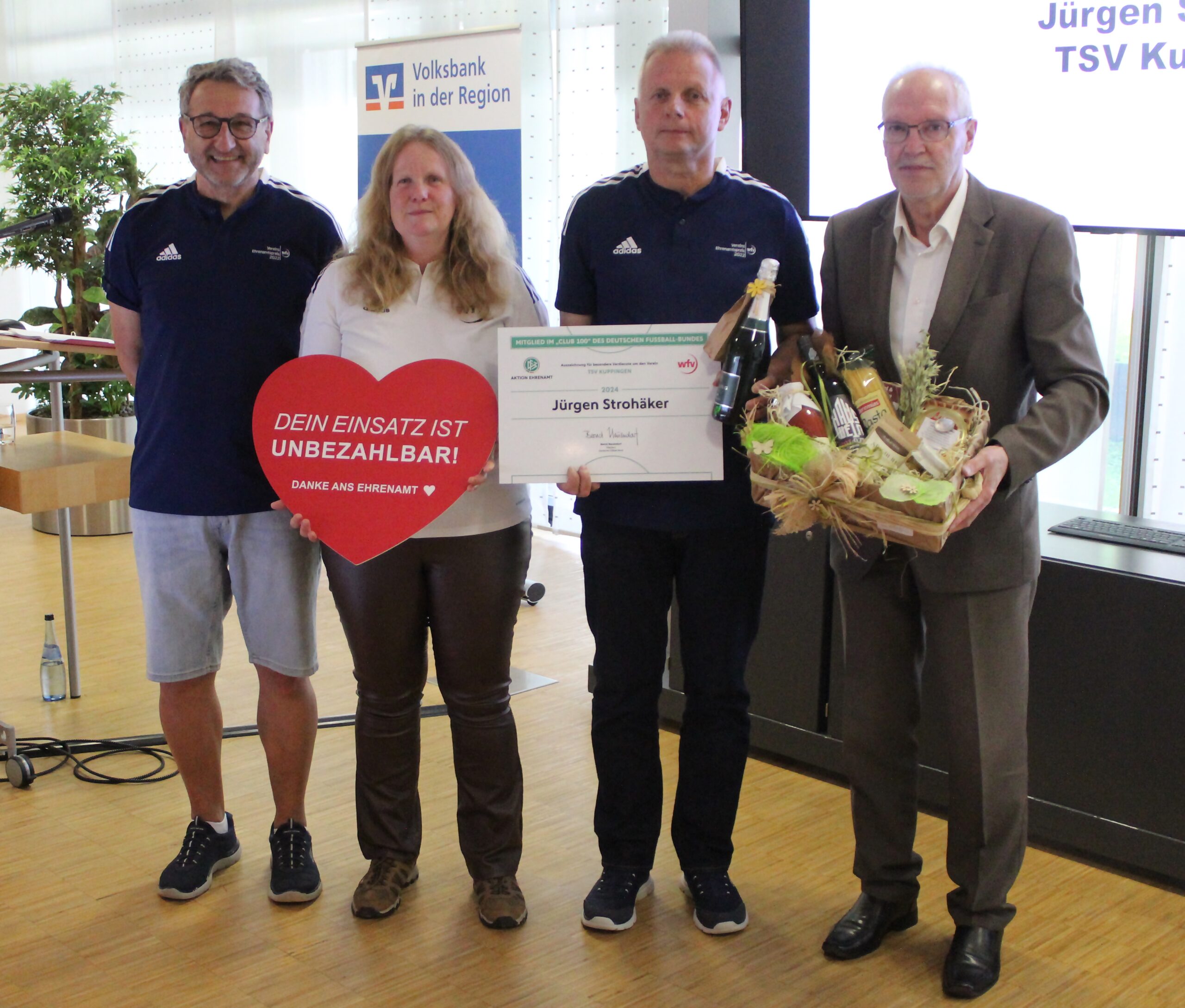Jürgen Strohäcker schließlich wurde als DFB Ehrenamtspreisträger ausgezeichnet und zudem in den „Klub 100“ aufgenommen. Strohäcker ist seit 1968 Mitglied beim SV Kuppingen und dort seit 1985 ehrenamtlich tätig. Seine Ämter: Co-Trainer, Beisitzer im Ausschuss der Fußballabteilung, Kassier im Förderverein, Platzwart. Während der Bauphase 2020 bis 2023 beim Umbau des Sportplatzgelände war er fast täglich vor Ort. Bei Vereinsfesten ist er mit im Organisationsteam, koordiniert „und hilft auch da wo er gebraucht wird“, sagte Anne Mehl.