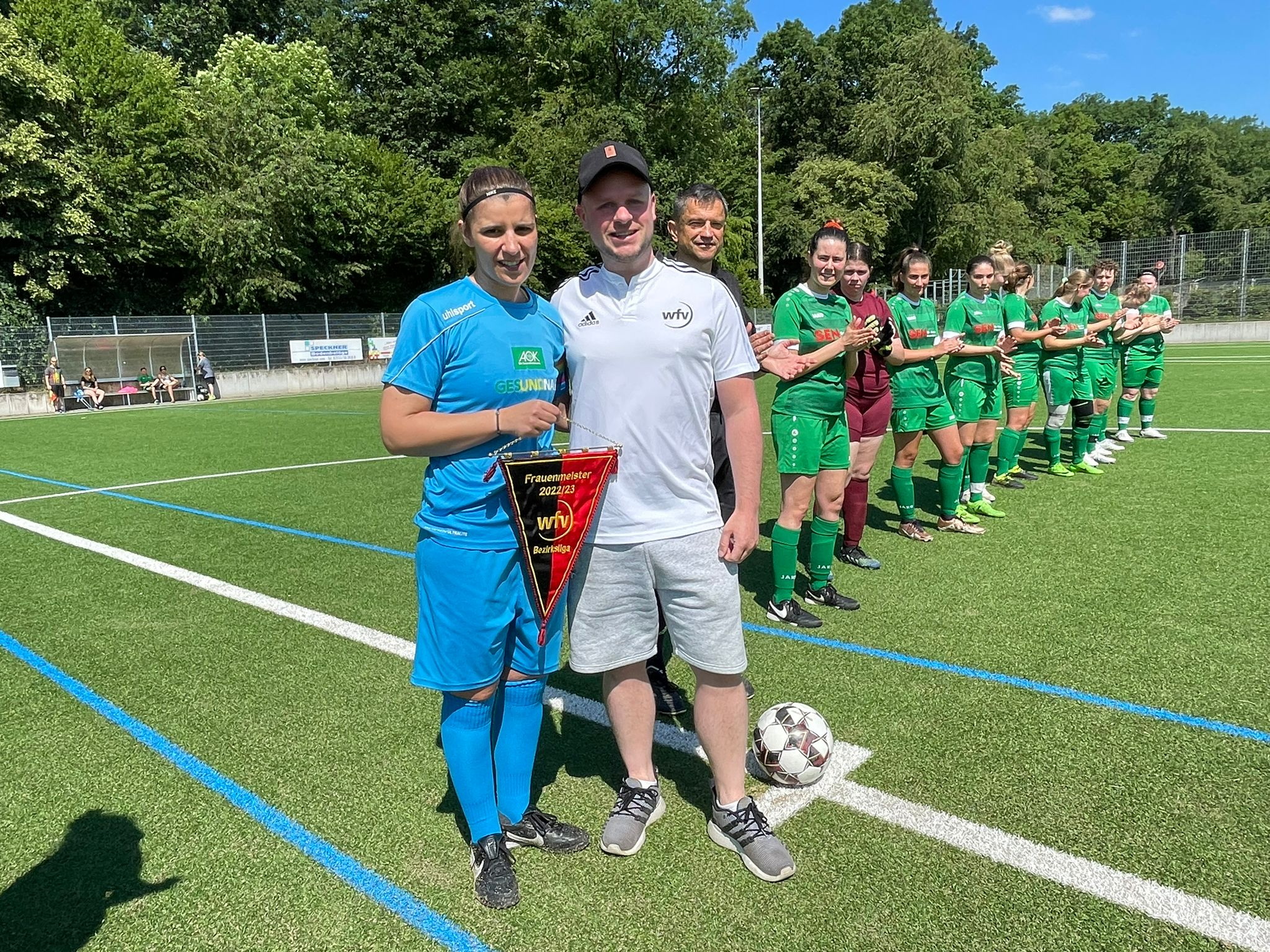 Mit sechs Siegen in Folge verabschiedeten sich die Fußball-Frauen des VfB Obertürkheim aus der Bezirksliga Rems-Murr/Stuttgart. Staffelleiter Martin Kling übergab den Meisterwimpel an VfB-Spielführerin Samantha Vatter nach dem letzten Saisonspiel beim SV Hegnach II. Der abschließende 4:0 (2:0)-Erfolg passte ins Saisonbild – 15 Siege aus 18 Spielen mit einer Trefferbilanz von 53:10 Toren sprechen eine deutliche Sprache. Auch die Kickerinnen von der Hafenbahnstraße mischen beim Erdinger-Cup mit – ihre sechs Spiele steigen am Samstag, 17. Juni, von 12:30 Uhr an auf dem Sportplatz des SV Oberjesingen bei Herrenberg.