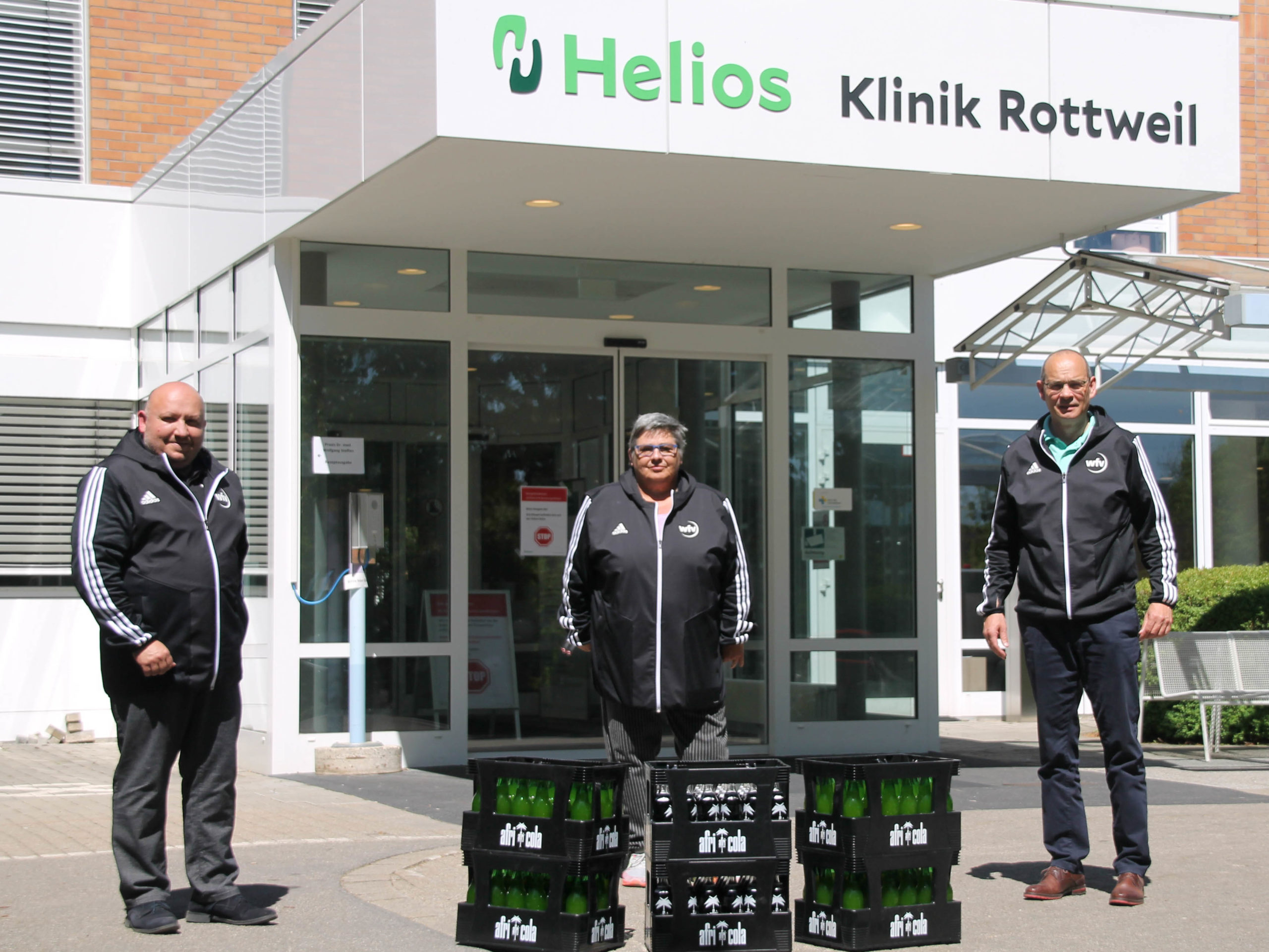 Vergangenen Donnerstag besuchte Marcus Kiekbusch, Bezirksvorstand des Fussballbezirk Schwarzwald mit Monika Alt und Nenad Popovic vom Bezirksvorstand, die HELIOS Klinik in Rottweil und überreichte 40 Getränkekisten, eine Spende des Fußballbezirks und seinen 80 Fußballvereinen.