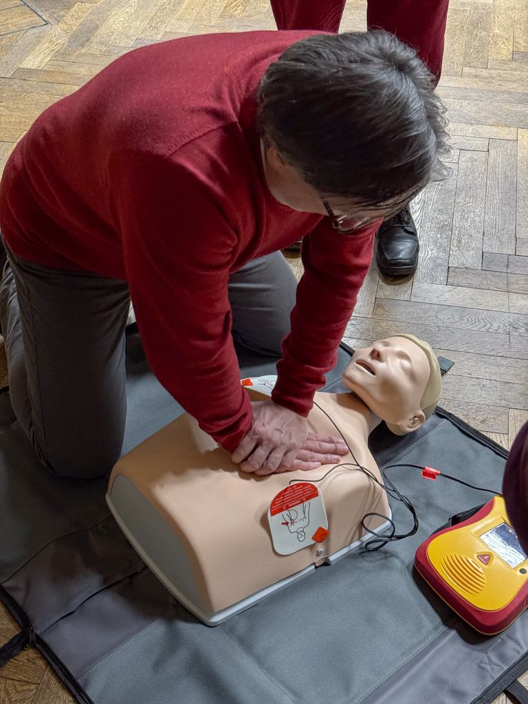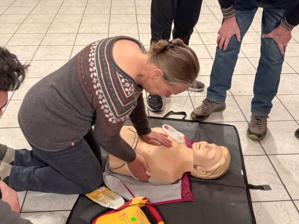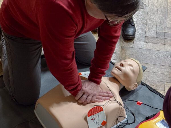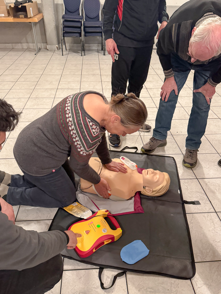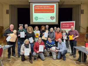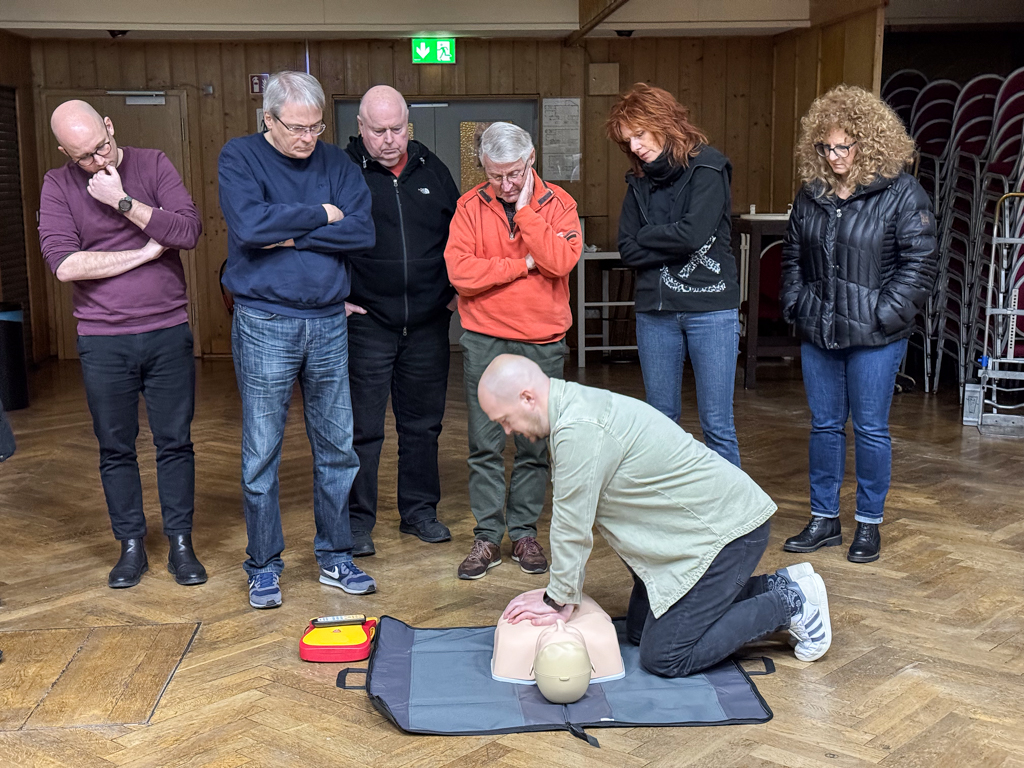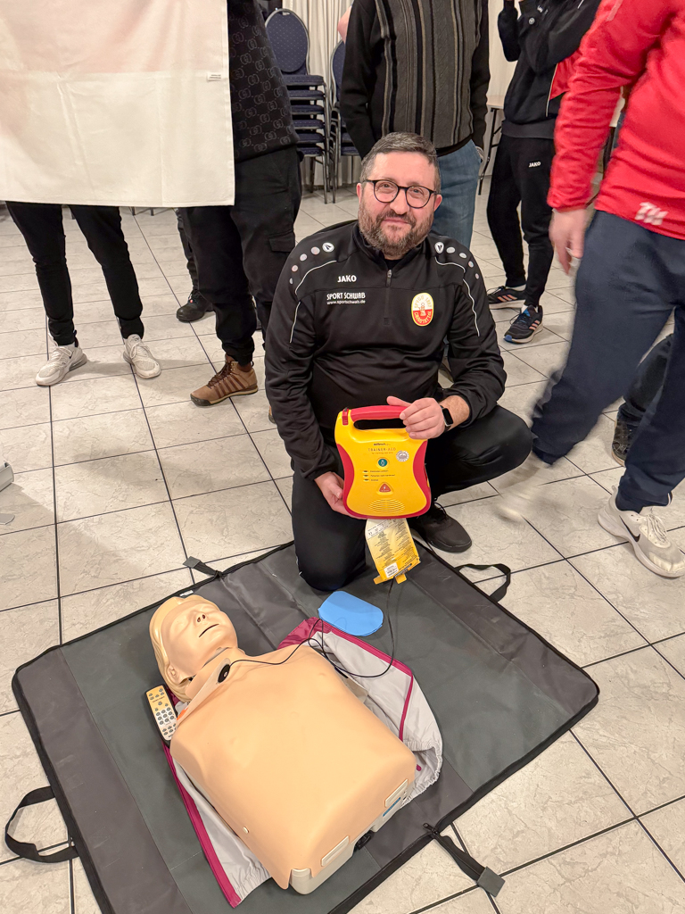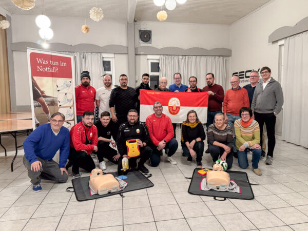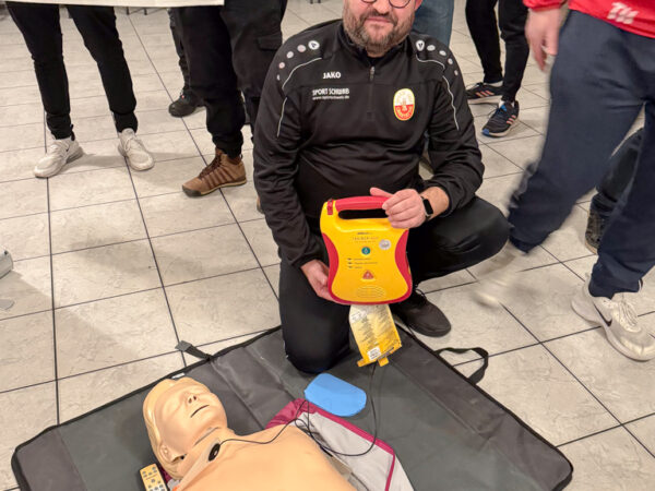 Die Serie trägt den Namen „Lebensretter sein“ und gibt Vereinsmitarbeiter*innen theoretische und praktische Hilfen an die Hand, um in Notsituationen schnell und richtig reagieren zu können. Die Referenten erklärten, was im Falle eines Herzstillstandes oder -infarkts bis zum Eintreffen eines Rettungsdienstes zu tun ist und demonstrierten die Anwendung eines Automatisierten Externen Defibrillators (AED).
