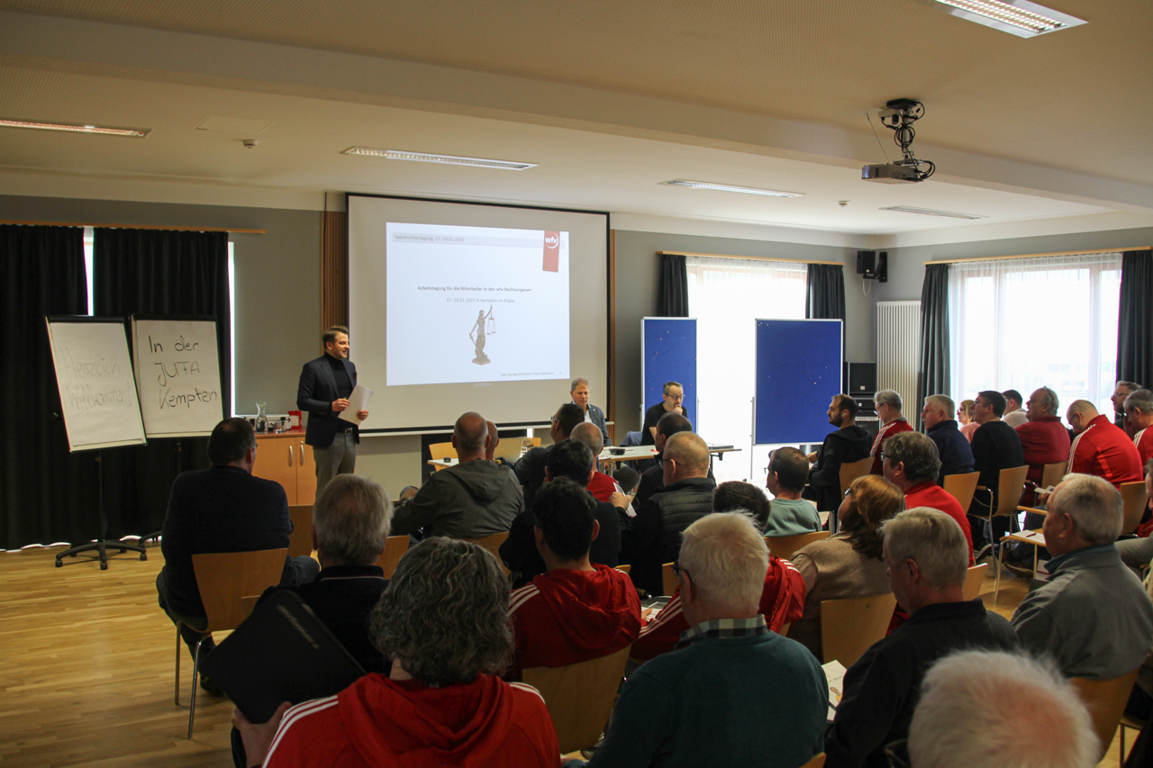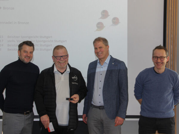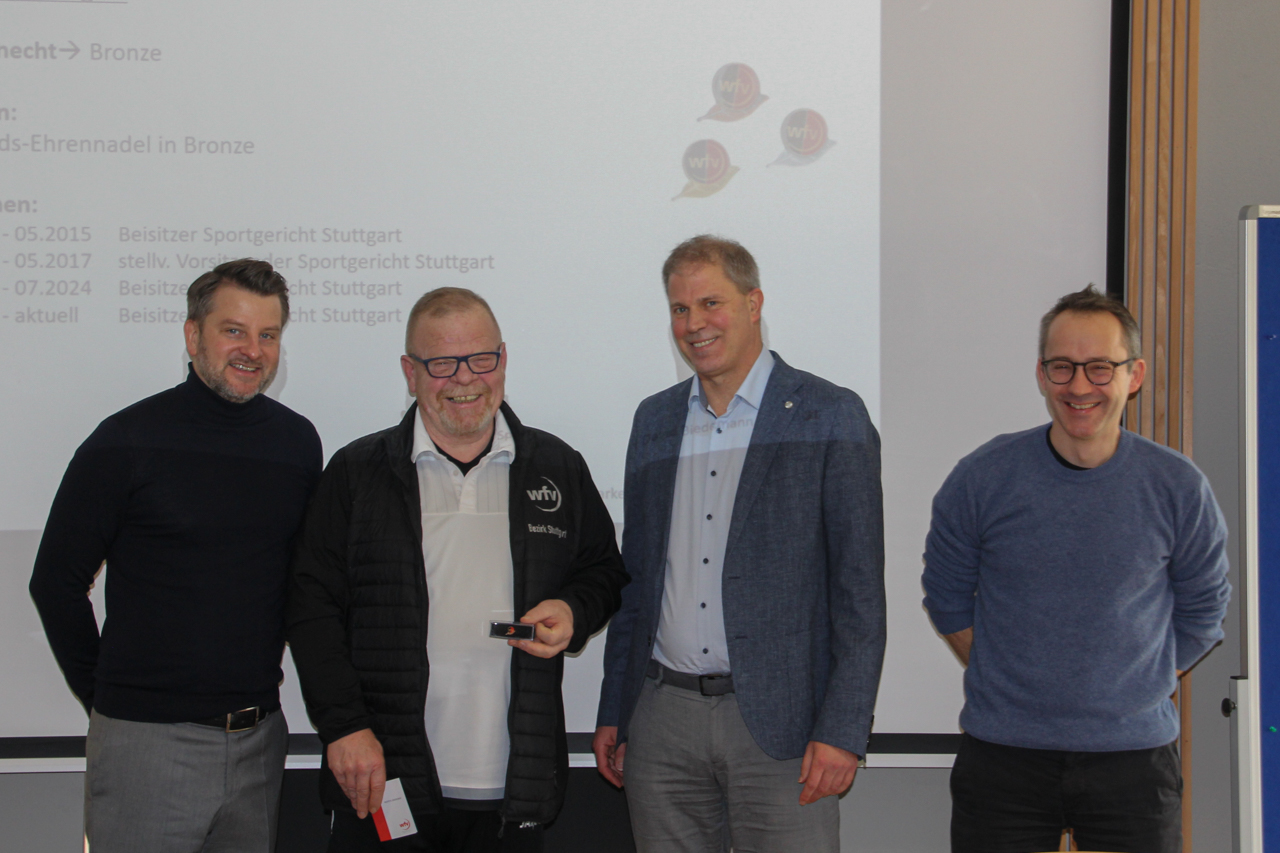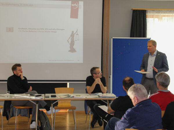 Die wfv-Sportrichter *innen trafen sich am vergangenen Wochenende zur Jahrestagung im JUFA Hotel in Kempten im Allgäu. Nach Eröffnung der Tagung durch Florian Müller-Metge, Vorsitzender des wfv-Verbandsgericht, begrüßte wfv-Vizepräsident Recht Dr. Florian Bollacher die zahlreichen wfv-Sportrichter*innen und berichtete über aktuelles aus dem DFB, SFV und wfv. Anschließend ehrte er Volker Knecht (Sportgericht Stuttgart-Böblingen) mit der Verbands-Ehrennadel in Bronze.