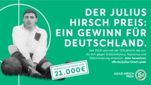 Julius Hirsch ist einer von nur zwei jüdischen Nationalspielern in der Geschichte des DFB. Vor dem Ersten Weltkrieg war der zweifache deutsche Meister und Olympiateilnehmer einer der populärsten Spieler im DFB-Dress. 1943 wurde Julius Hirsch von den Nazis deportiert und in Auschwitz ermordet. Mit der Stiftung des Julius Hirsch Preises erinnert der DFB seit 19 Jahren an den ehemaligen Fußballer sowie an alle Opfer des nationalsozialistischen Unrechtsstaates.