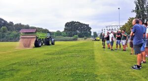 Darüber hinaus wurden weitere Pflege- und Regenerationsmaschinen vorgestellt und das Thema Grundpflege von Rasenplätzen erläutert. Auch das Mähen durch Sichelmäher mit Schnittgut-Absaugung wurden live vorgeführt. Weitere Themen waren die fachgerechte Düngung und Bewässerung von Rasenplätzen.