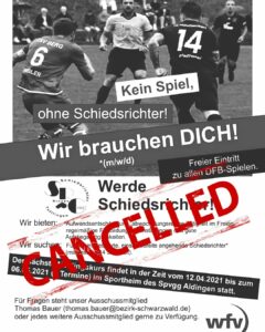 Vom 12.04.2021 – 06.05.2021 findet der diesjährige Schiedsrichter-Neulingskurs im Sportheim der SpVgg Aldingen statt.