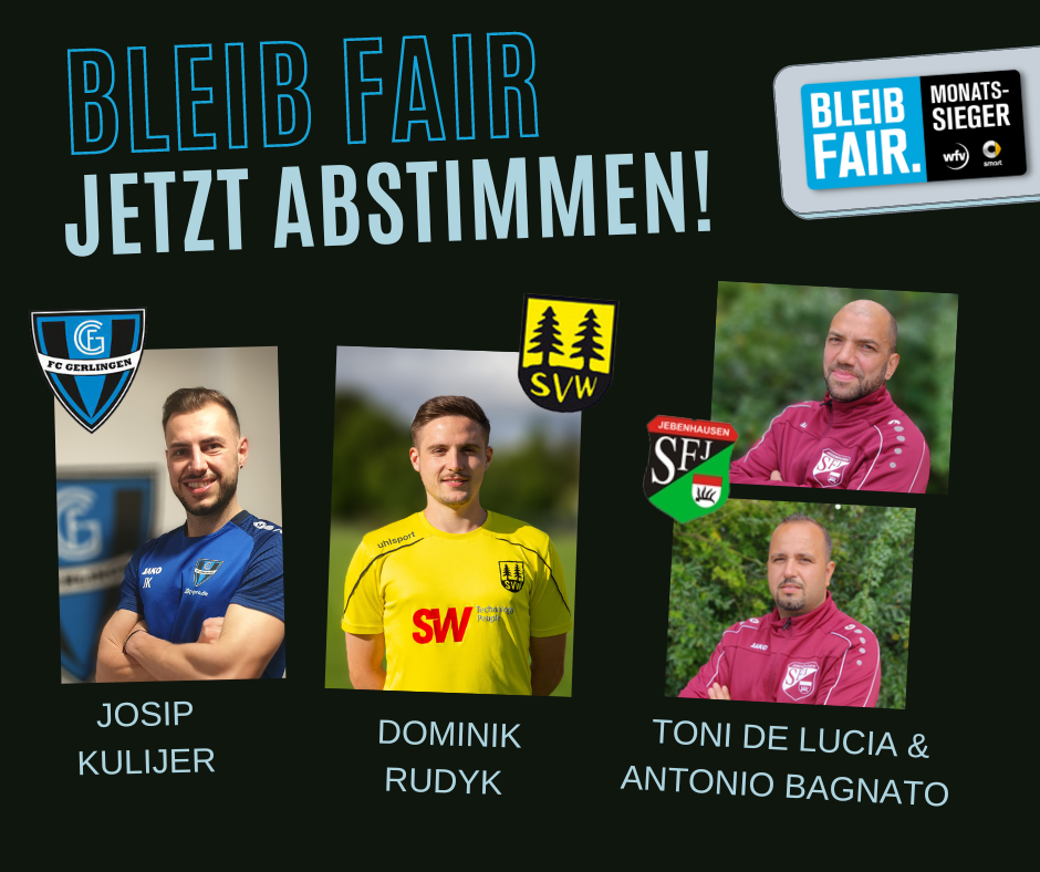 In vielen Staffeln biegen unsere wfv-Vereine bereits auf die Zielgerade der Saison 2022/23 ein. Höchste Zeit, den ersten Monatssieger des Jahres zu wählen! Wir haben alle Fairplay-Aktionen aus dem Januar, Februar und März gesammelt und präsentieren die besten drei im Rahmen unserer von smart unterstützten Kampagne BLEIB FAIR. Welche Aktion überzeugt euch am meisten? Jetzt abstimmen!