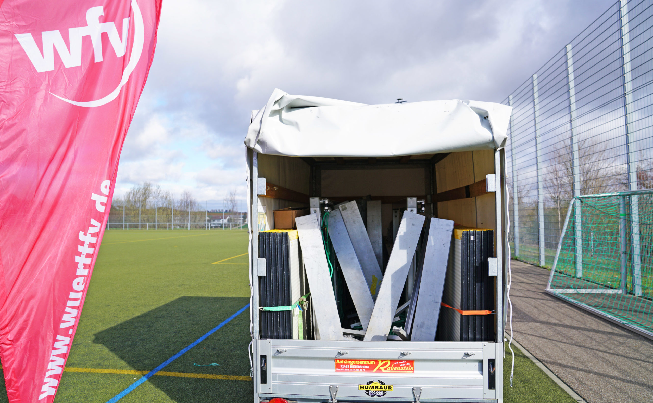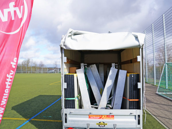 Die Street-Scoccer-Courts werden in Ditzingen und Rißtissen gelagert und müssen dort abgeholt werden. Für den Transport befindet sich der Court auf einem Anhänger mit einer Gesamtlast von 940 Kilogramm.