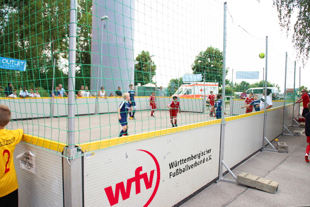 Das 15x10m große Spielfeld sorgt mit einer 1,20 m hohen Bande für eine hohe Intensität des Spiels. Die Vollbande ergänzt dabei ein drei Meter hohes Netz. Da der Soccer-Court über keinen Boden verfügt, kann der Untergrund selbst gewählt werden. Mit dem Street-Soccer-Court ist Spaß und Freude am Straßenfußball auf jeden Fall garantiert! Einzig auf Sand darf der Court nicht aufgebaut werden. Die Courts können über die wfv-Geschäftsstelle ausgeliehen werden.