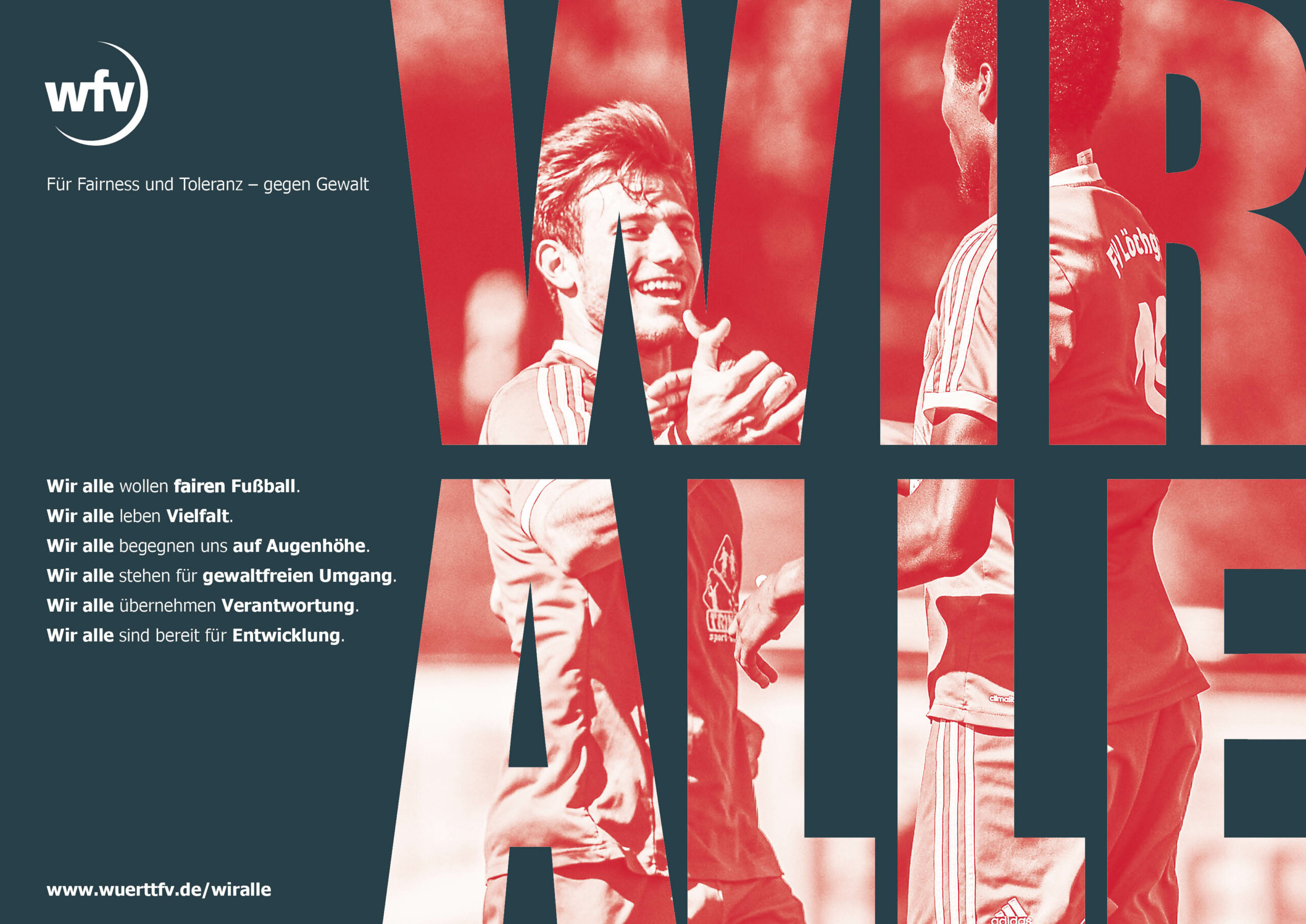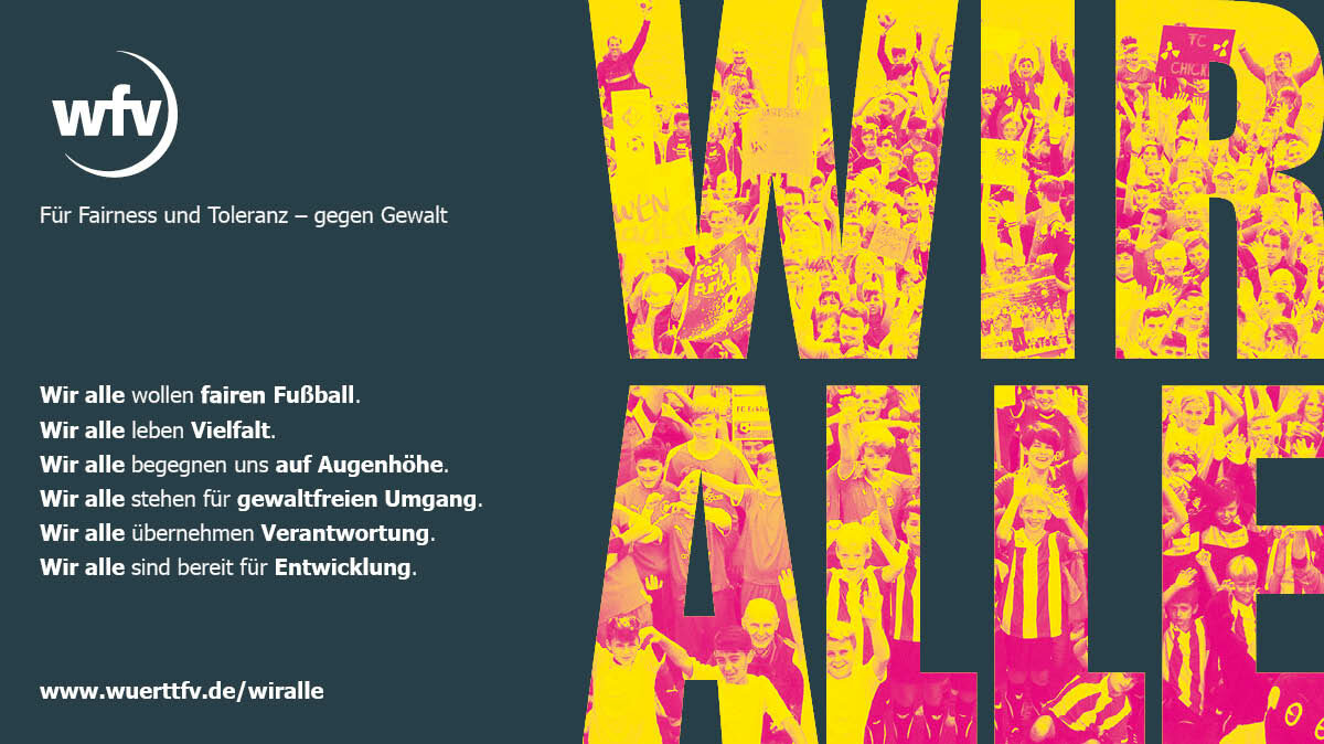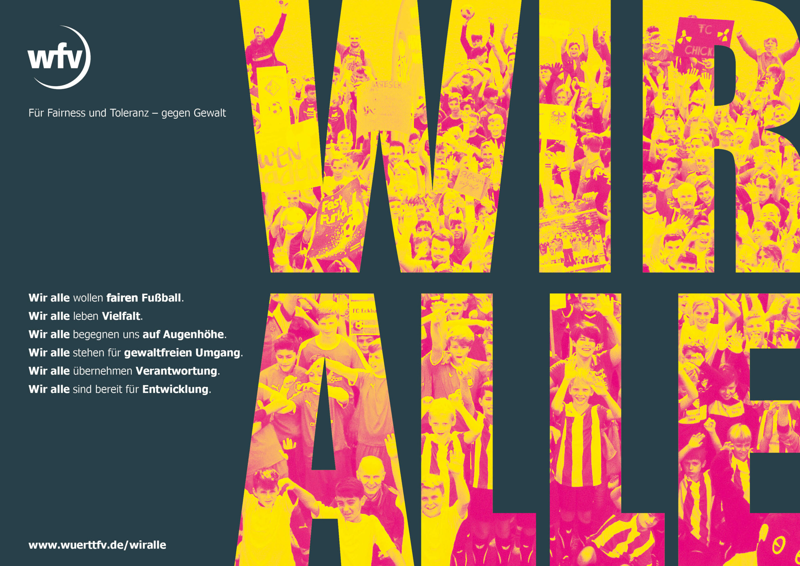 Mit dem Plakat möchten wir, der Württembergische Fußballverband und seine Kommission „wfv für Fairness und Toleranz – gegen Gewalt“, einen Beitrag im Sinne des fairen Fußballs leisten. Die Kampagne „WIR ALLE“ soll ein weiteres öffentlich sichtbares Bekenntnis gegen Gewalt und Diskriminierung von ALLEN Beteiligten auf und neben dem Fußballplatz setzen. Setze auch du ein Zeichen und hänge das Plakat in deinem Verein auf – alle wfv-Vereine können sich die Plakate kostenfrei bei unserer Kontaktperson bestellen.